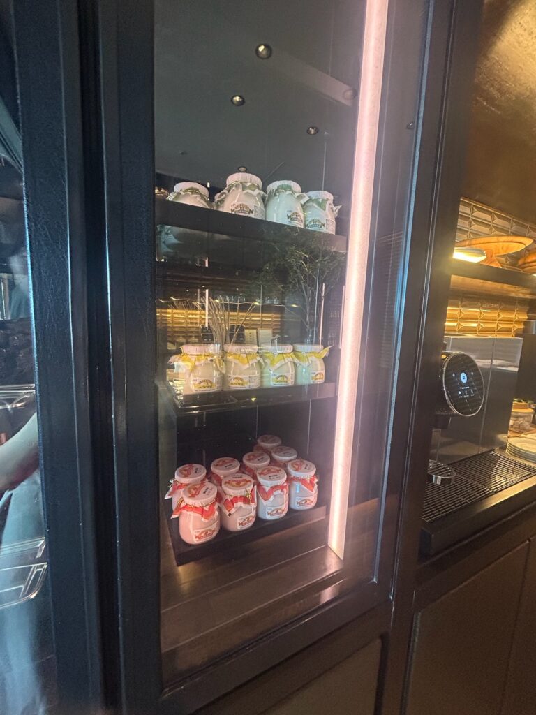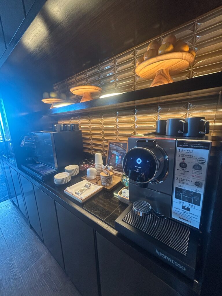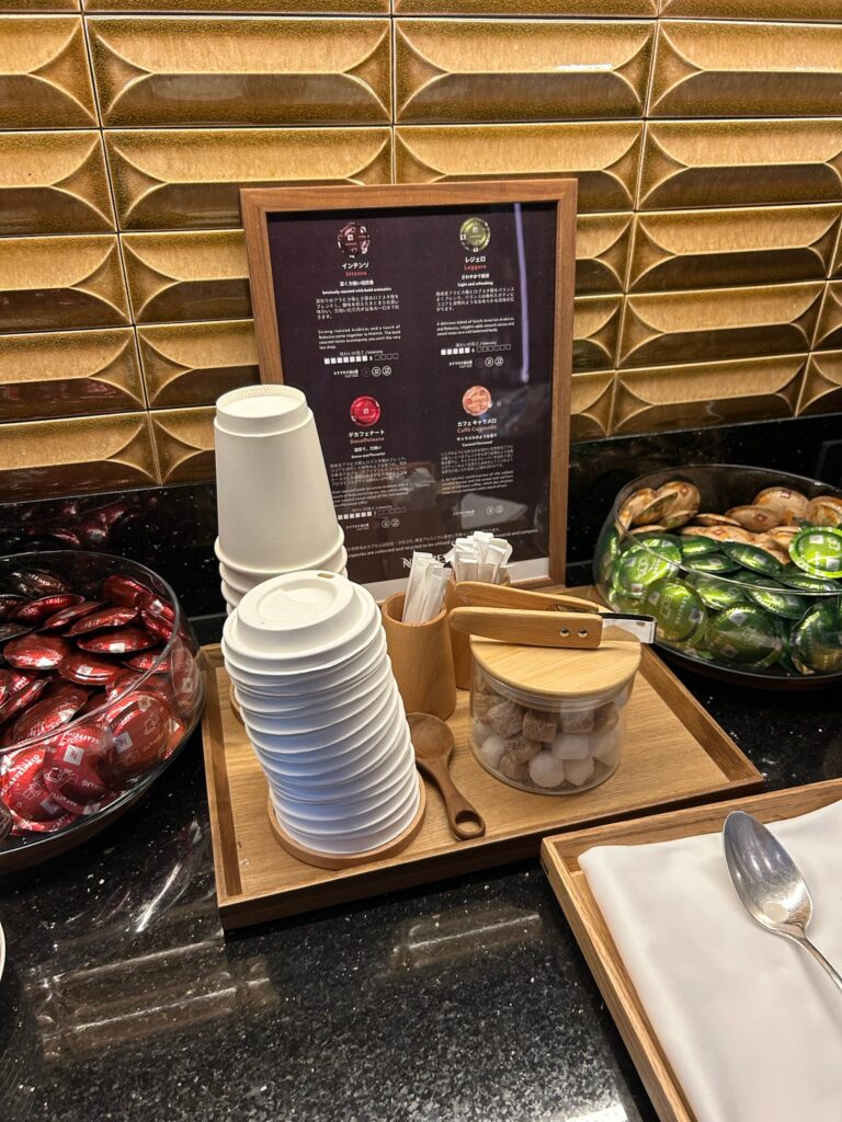 コーヒーはカプセル式。私はカフェオレにしようと思ったのですが、なぜか温かいミルクのお湯割が…スタッフさんがすぐに新しいものと交換してくださりました