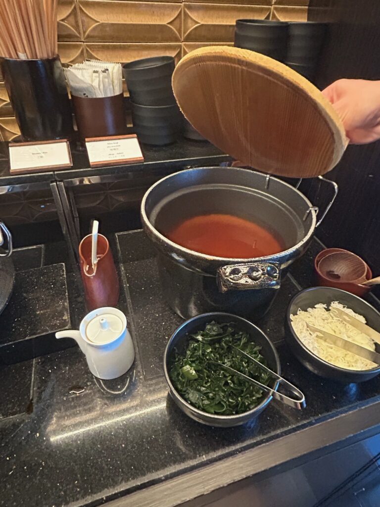 具材はネギとわかめと、シンプルです。シンプルイズベスト。鍋のふたが木なのがいいですね。