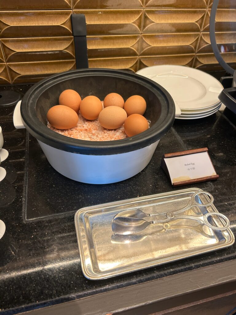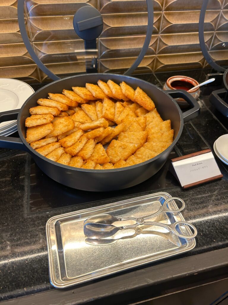 ハッシュドポテトやゆで卵といった朝の定番のラインナップが並んでいます。